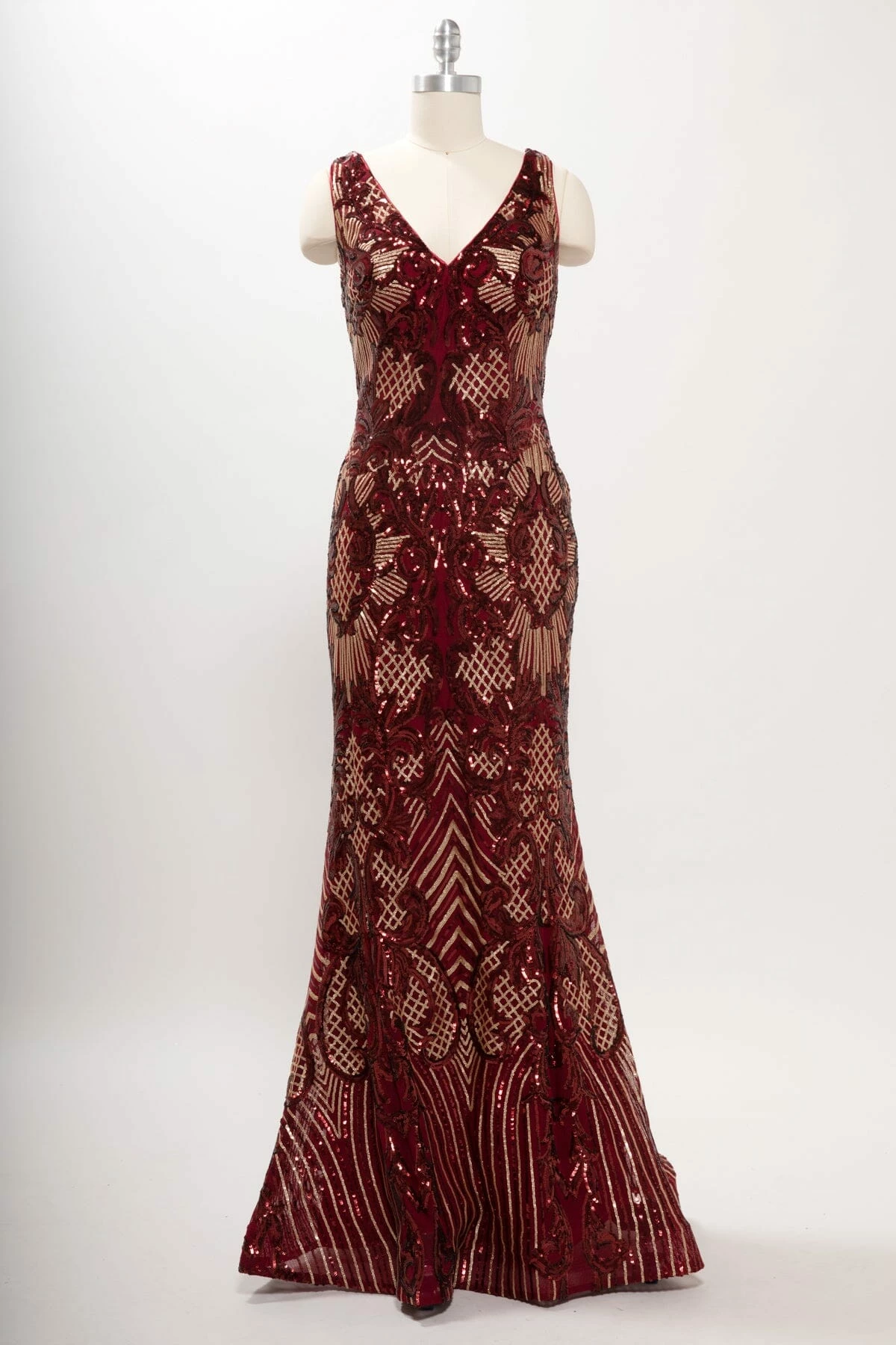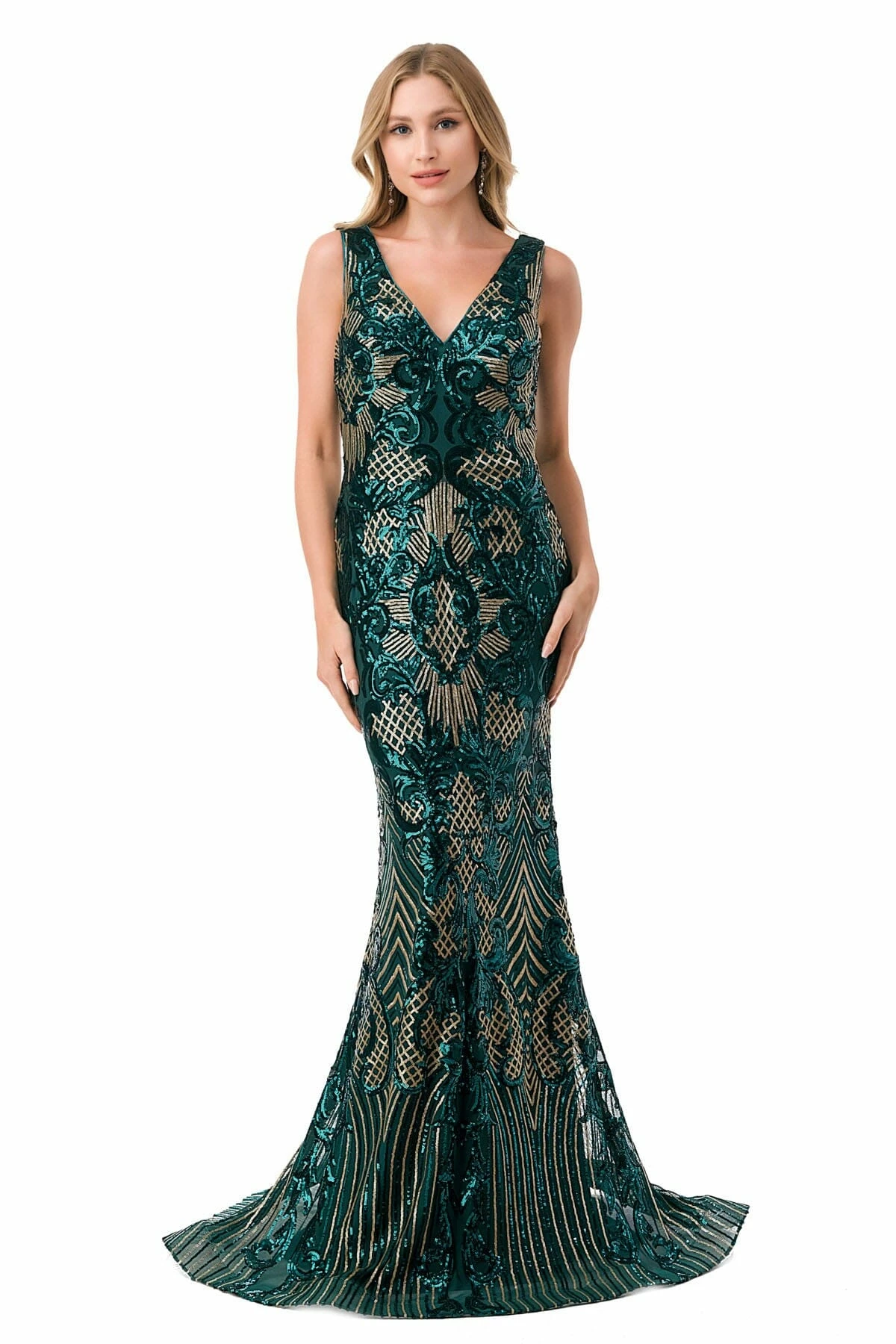 Light up the room in this sequin print long sleeveless V-neck dress with fitted mermaid skirt from Coya Collection by Aspeed Design M2803Y.