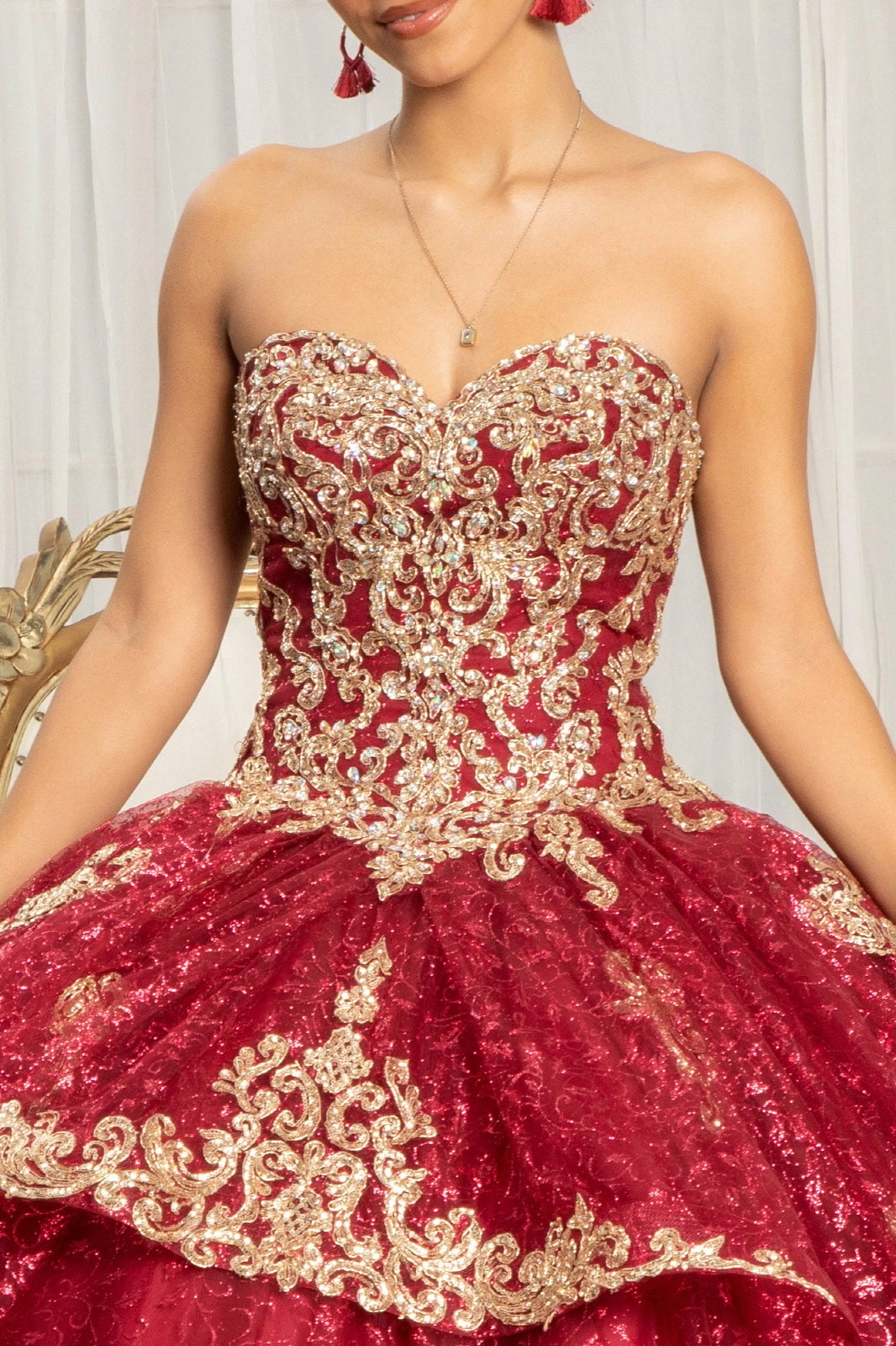 Receive lots of compliments in this sequin print long strapless dress with layered A-line skirt by Elizabeth K GL1987. This ballgown features a sweetheart neckline and classic corset back. Dazzling sequins are embellished in splendid pattern, and the bodice and skirt layers are elegantly embroidered.