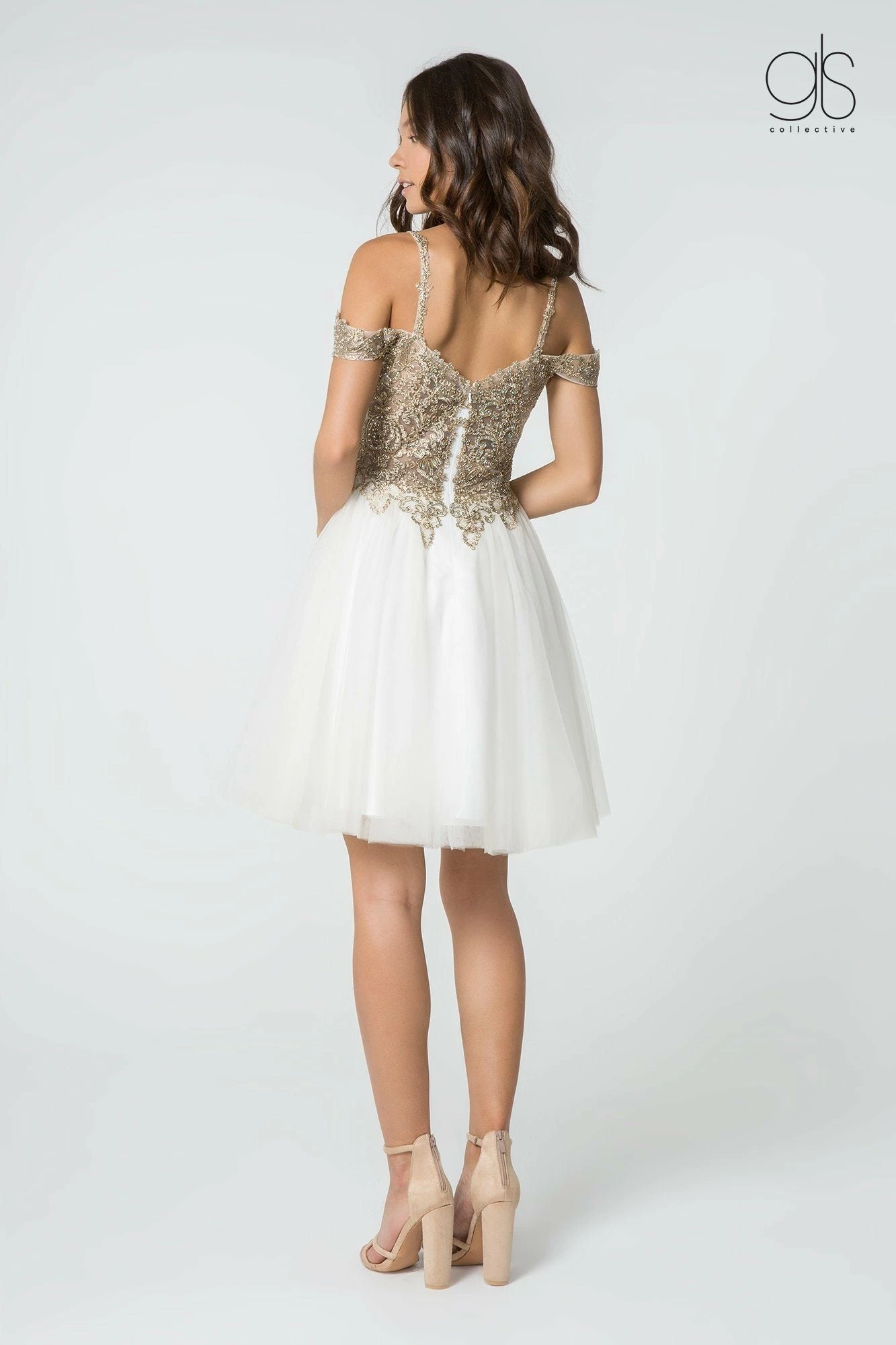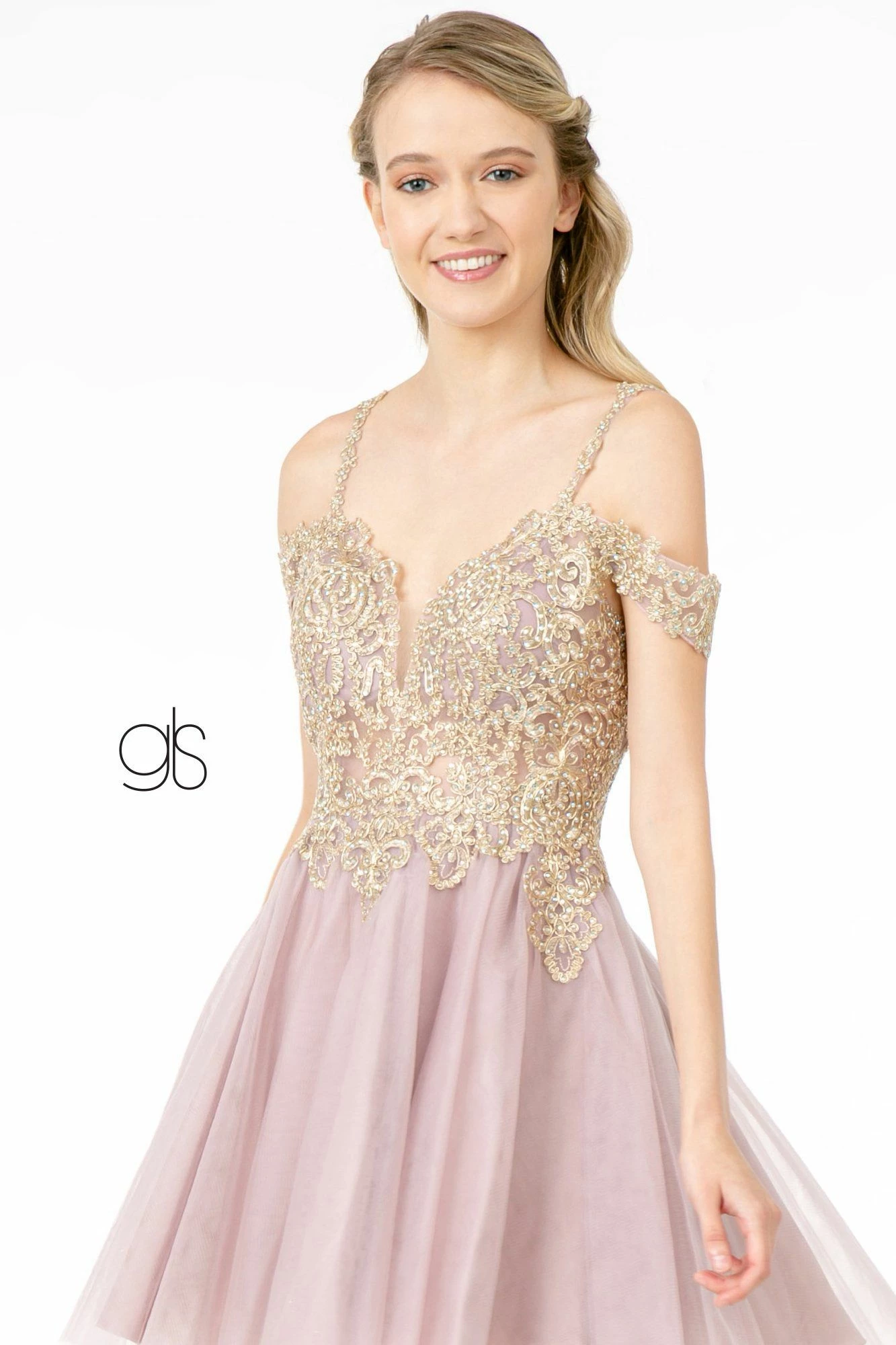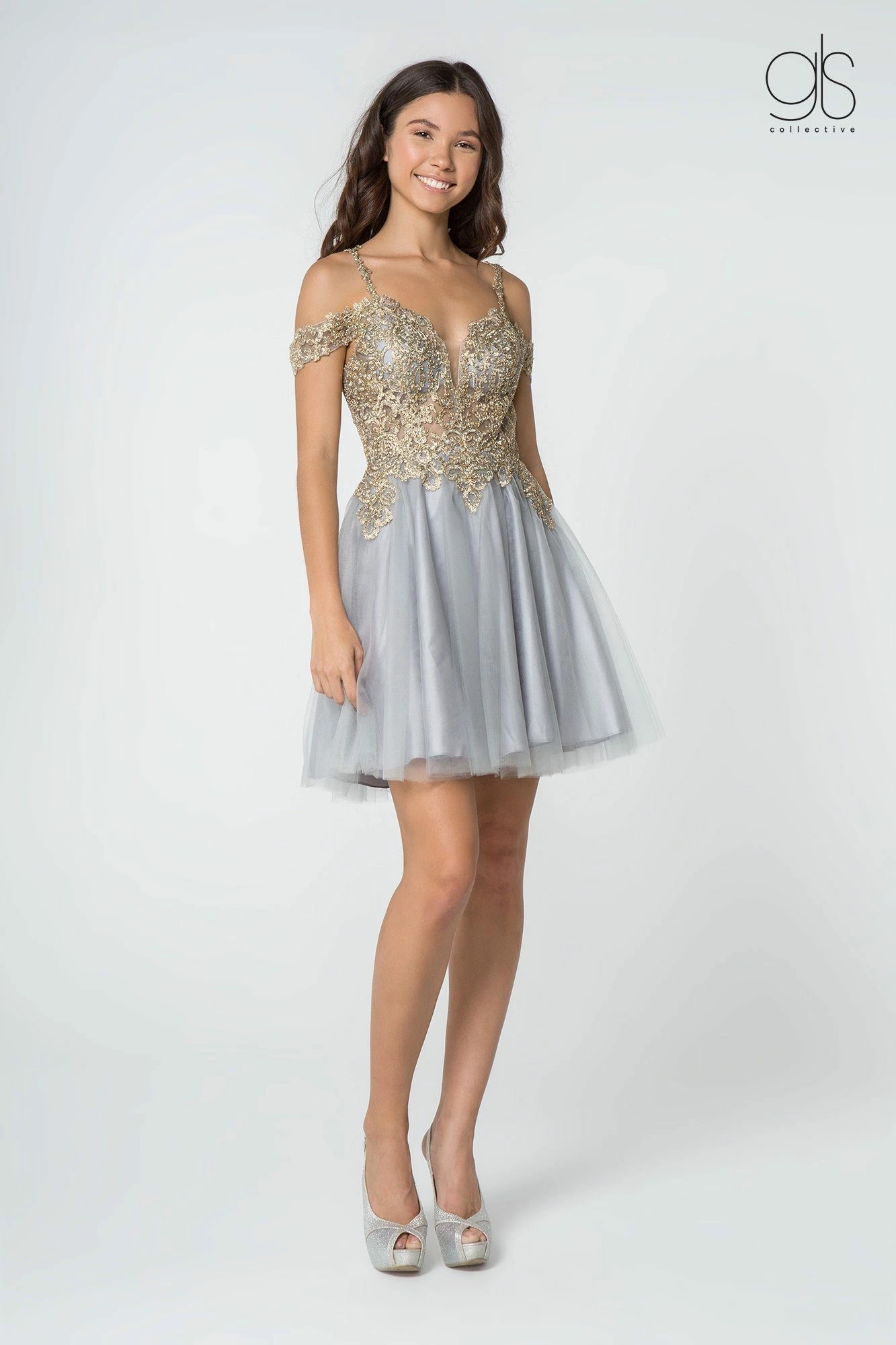 All eyes will be on you in this gold applique short cold shoulder A-line dress with illusion bodice by Elizabeth K GS2808.