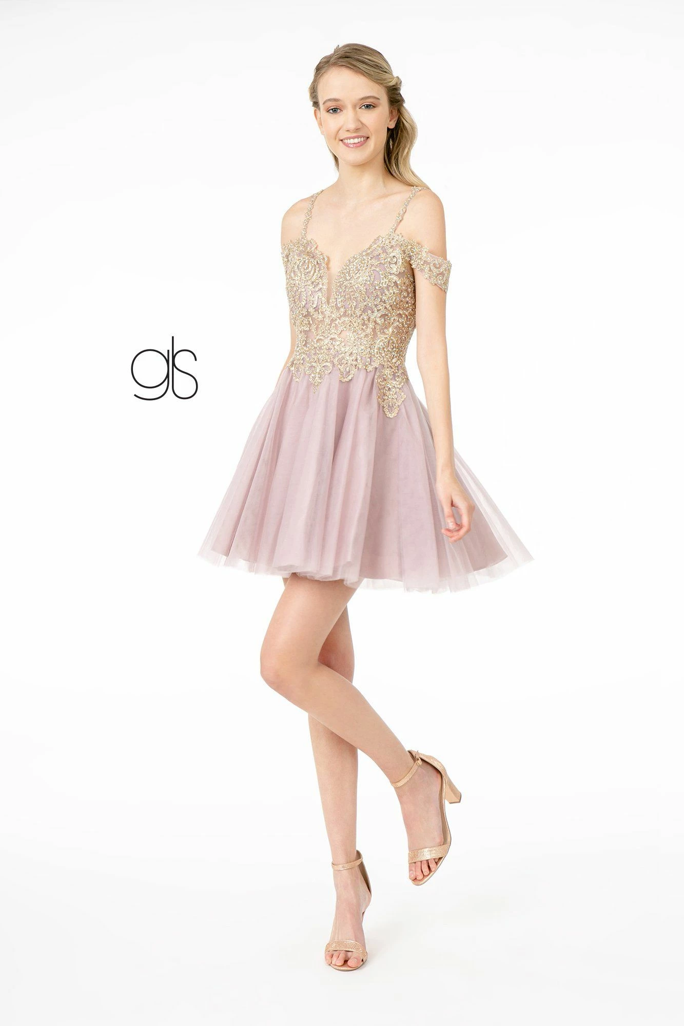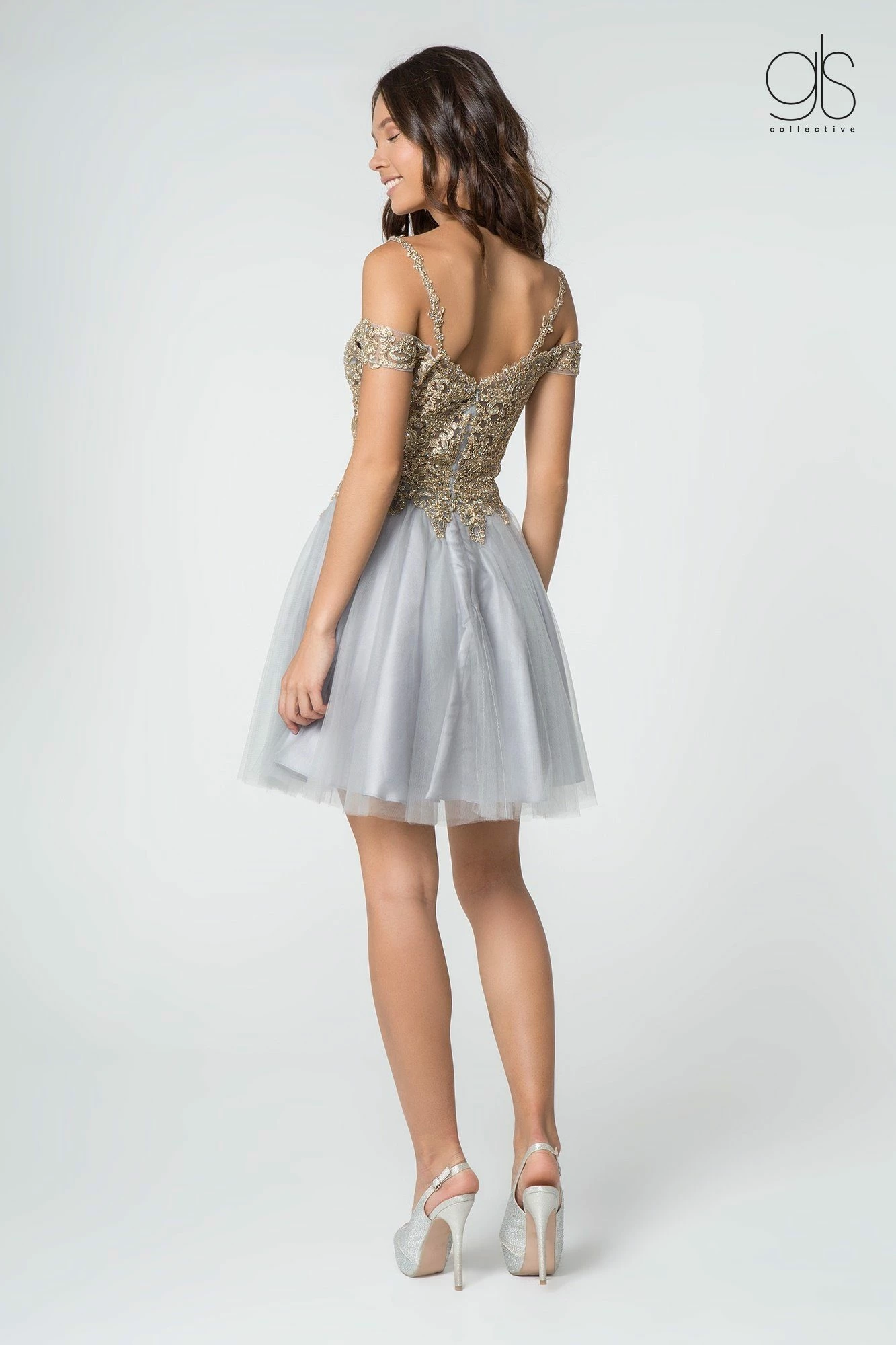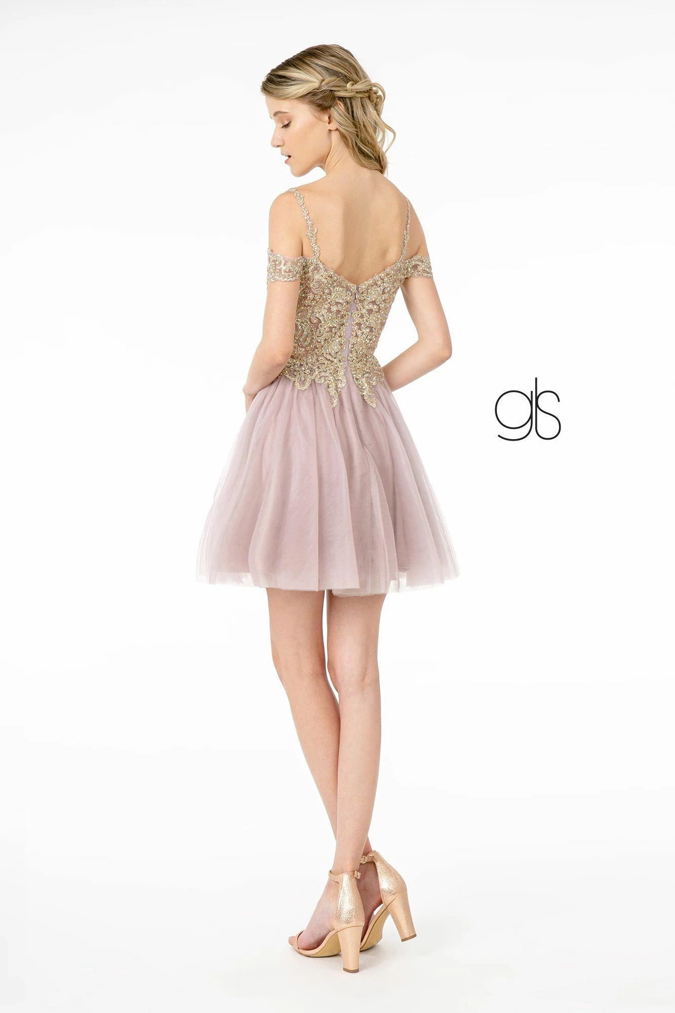 All eyes will be on you in this gold applique short cold shoulder A-line dress with illusion bodice by Elizabeth K GS2808.