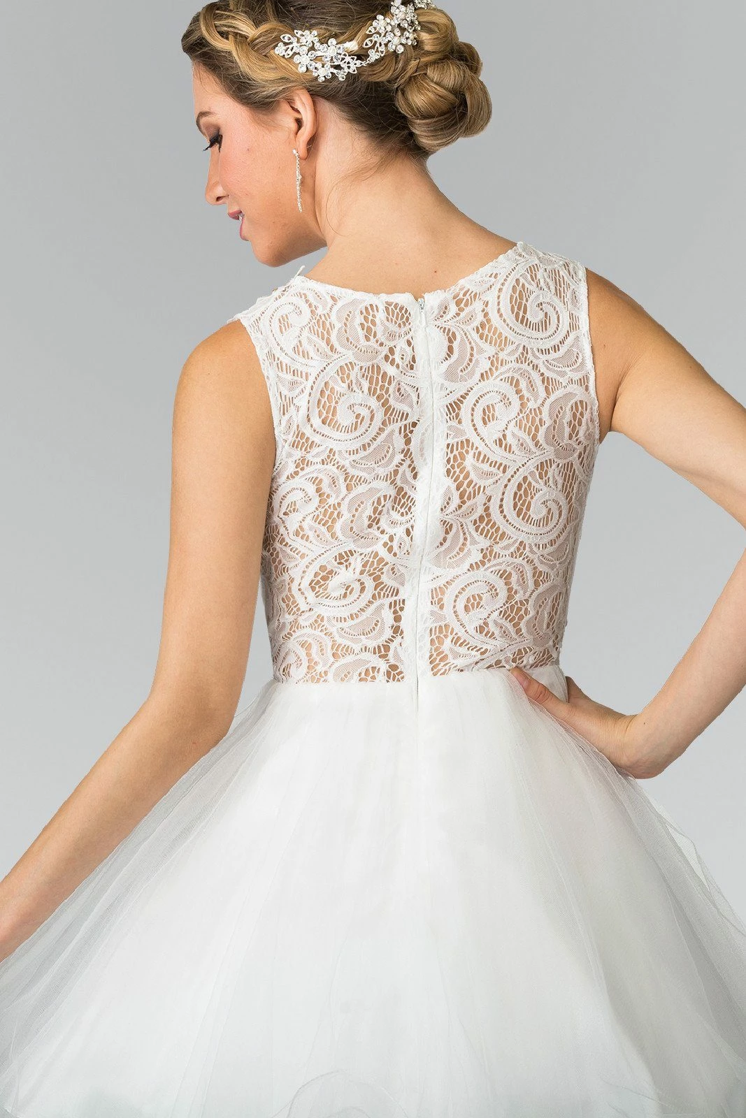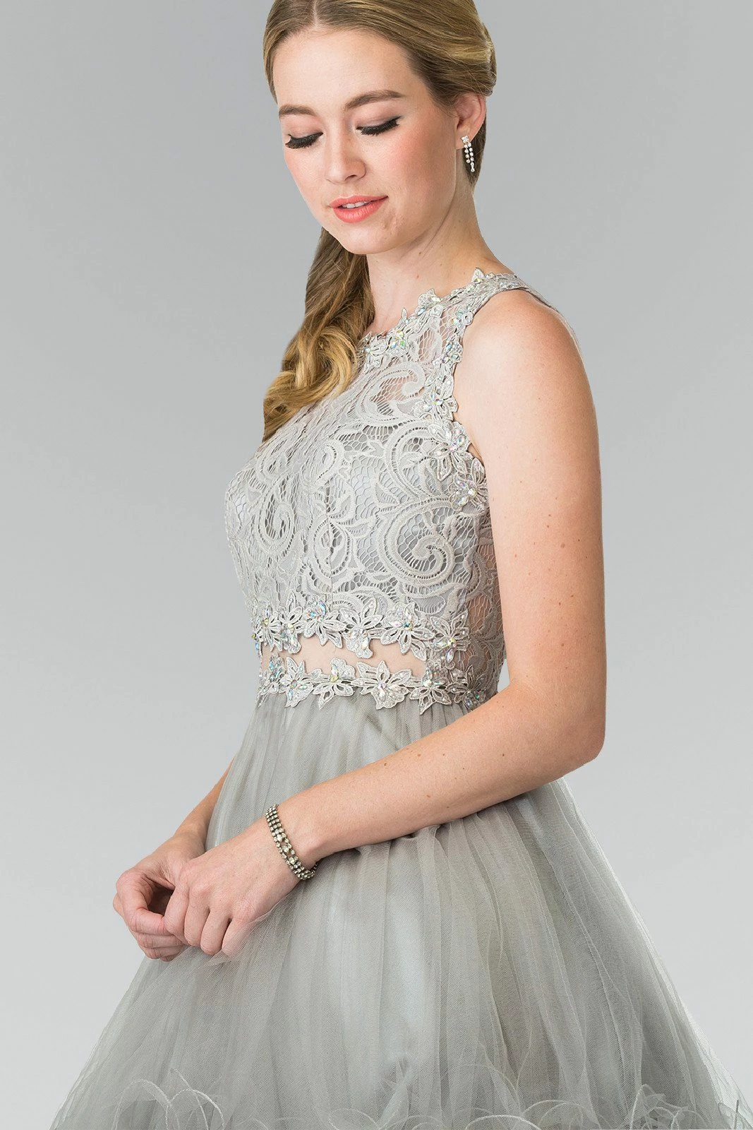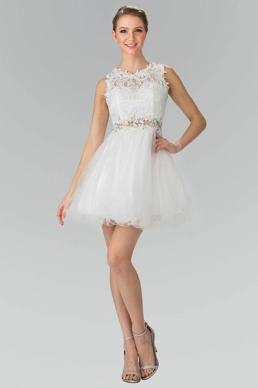 Think of how amazing you’ll look in this short sleeveless dress with lace bodice and sheer waistline by Elizabeth K.