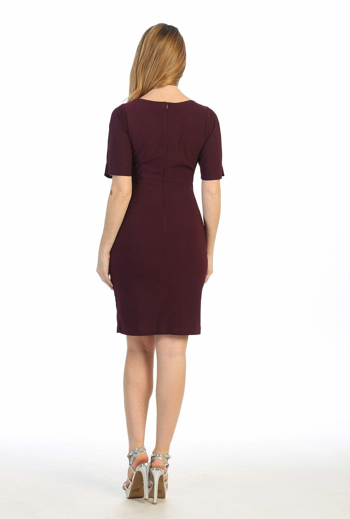 Look sophisticated in this short fitted V-neck dress with short slit sleeves by Celavie 6500. Short form fitting dress with V-neckline, slit sleeves, enclosed back, knee length A-line skirt, and a zipper closure. Affordably priced at $120, this short-sleeved dress is perfect for any formal event and will keep you on budget!