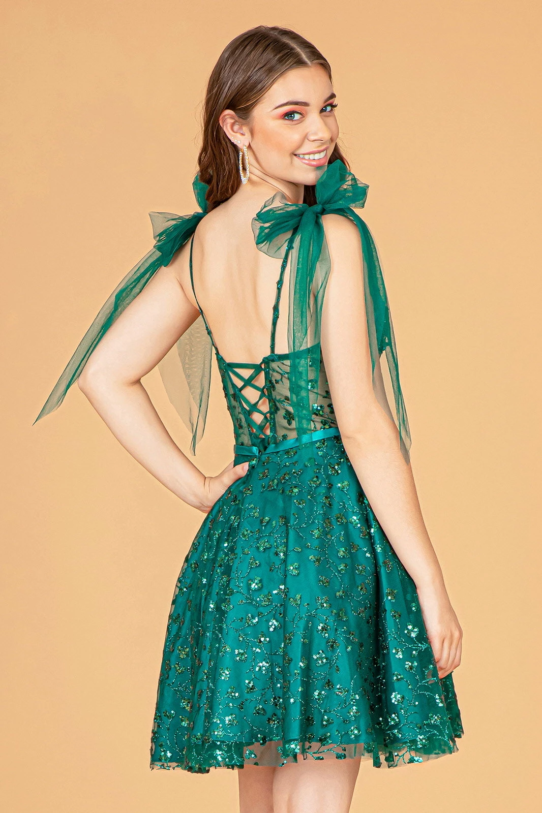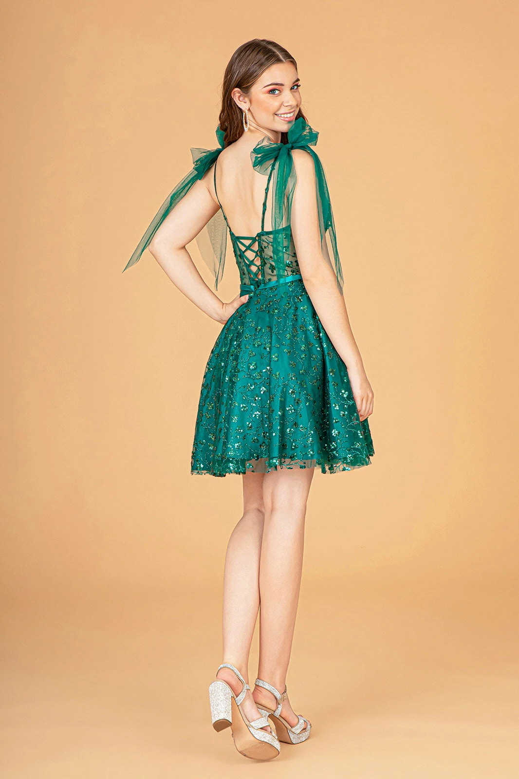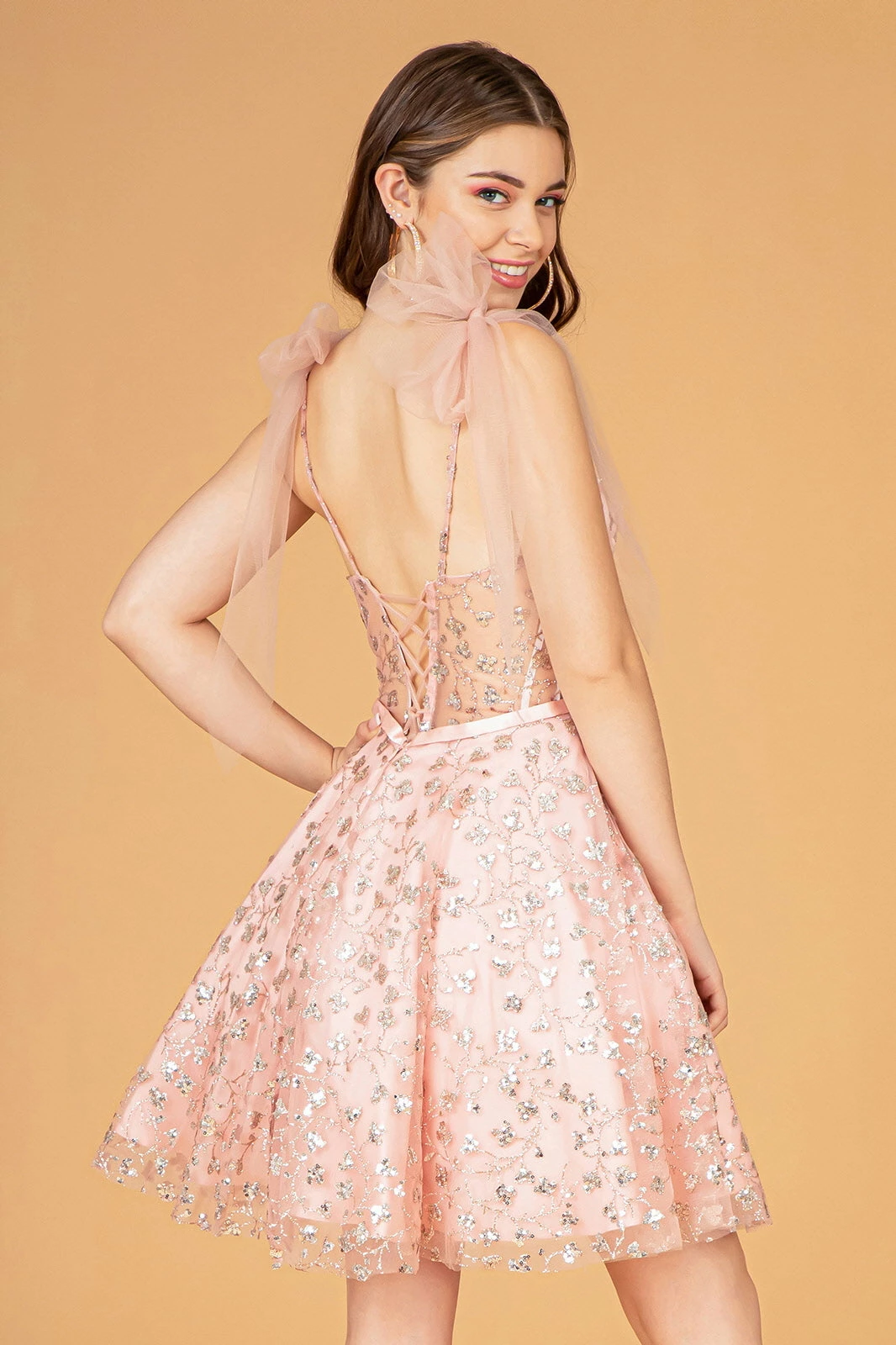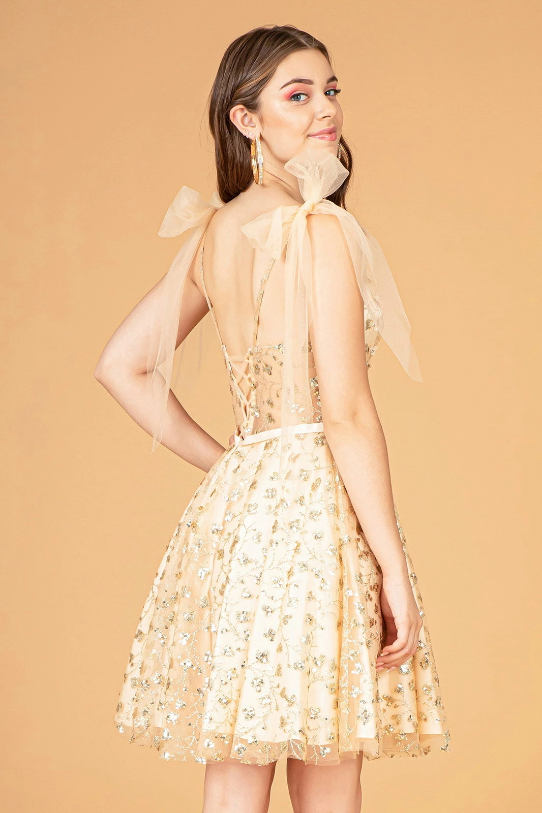 Look breathtaking in this 3D floral short sleeveless glitter print dress with A-line skirt by Elizabeth K GS3088. This mesh babydoll short dress features mesh ribbons on the shoulders creating an adorable and unique vibe. Open sheer back with spaghetti strapped lace-up ties adds a playful touch while the allover sparkly glitter floral print looks incredible.