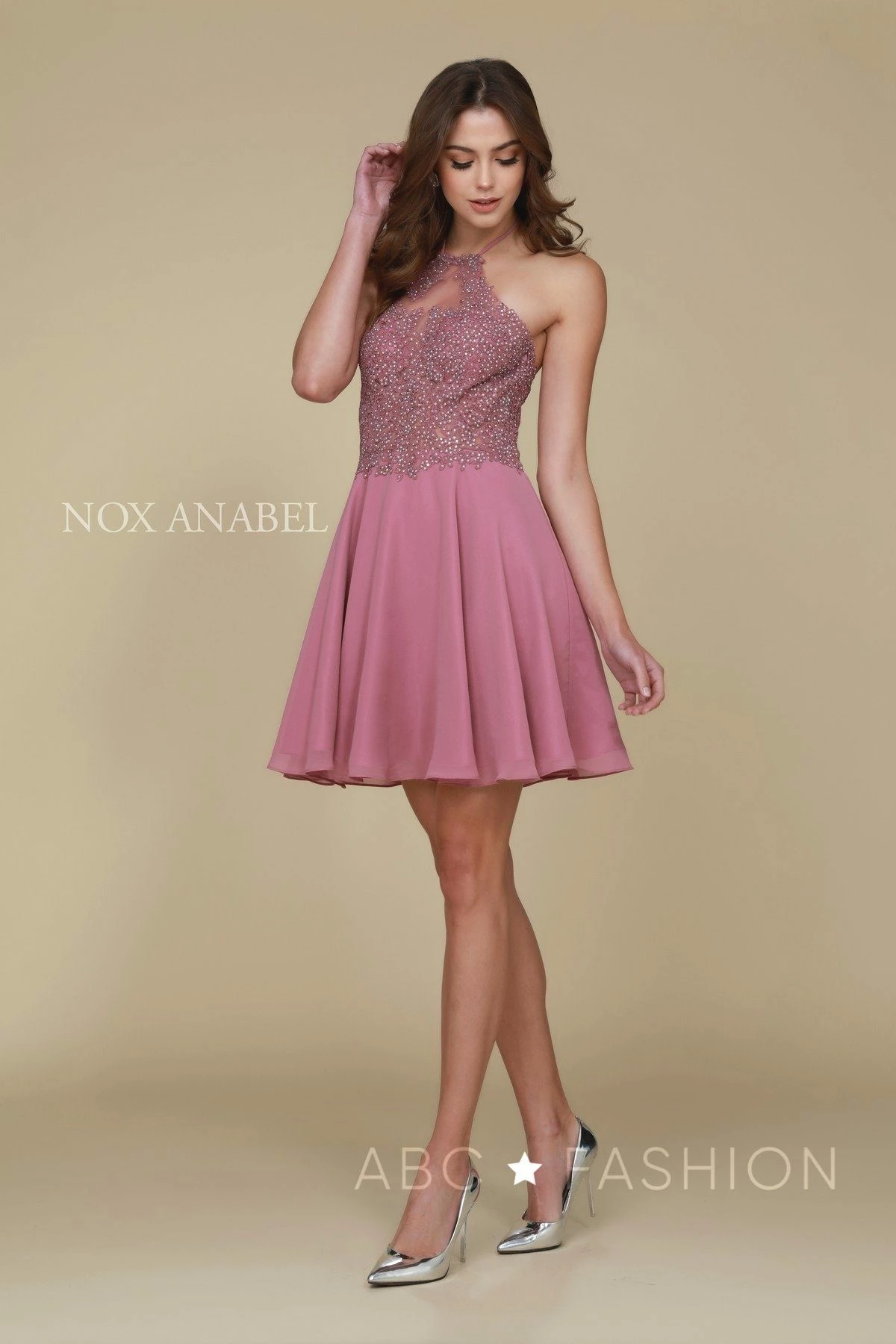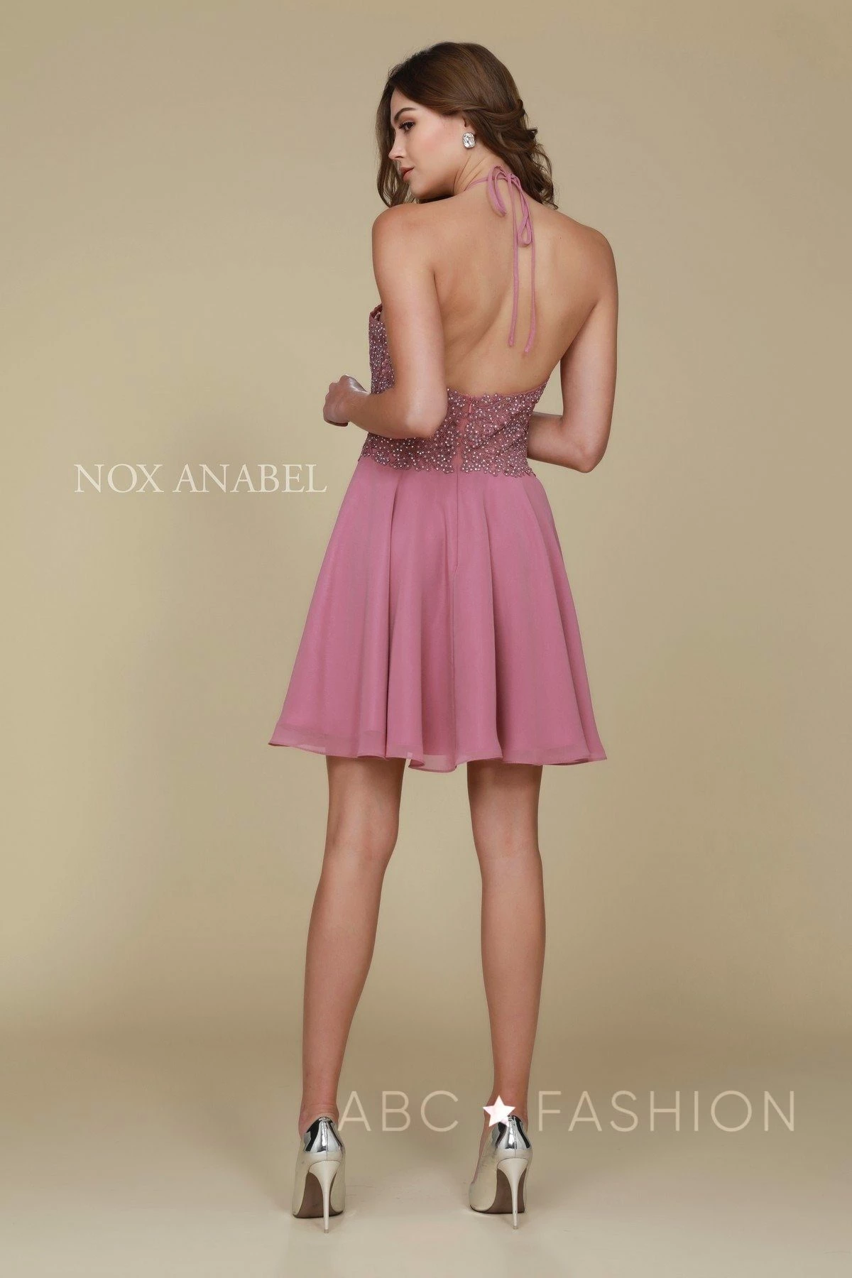Look picture-perfect in this halter chiffon cocktail dress with embroidered applique bodice by Nox Anabel G657. This short party dress features a halter bodice that’s embroidered with beaded lace appliques, sheer mesh at the high neckline, flirty crisscross open back, a short form-fitting skirt that falls above the knees, and a zipper back. Affordably priced under $150, this dress is perfect for any semi-formal event and will keep you on budget!