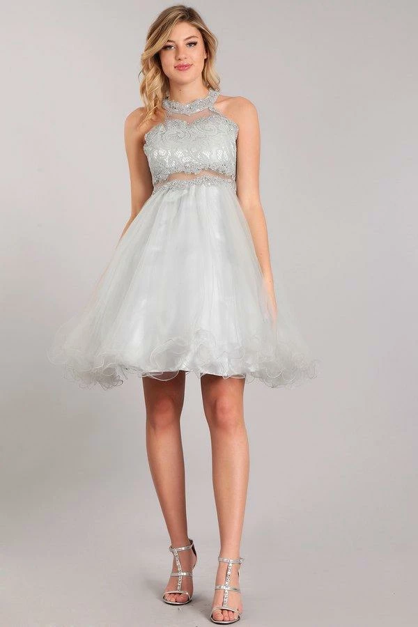 Be selfie ready in this short ruffled halter dress with sheer lace bodice by Cinderella Couture 5040X. Short halter dress in a fit and flare style with a lace bodice, illusion waistline, rhinestone design, solid pleated tulle skirt, ruffled hem, lace back with keyhole cutout, and back tie with a zipper closure. A matching scarf is included.