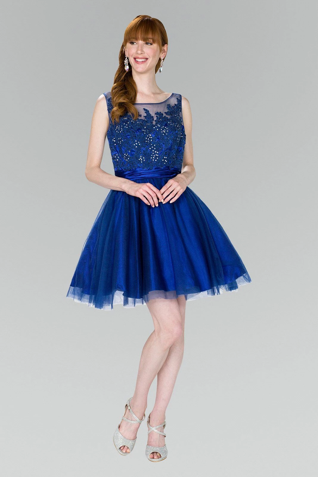 Light up the room in this illusion cocktail dress with lace bodice by Elizabeth K GS2414. This short party dress features an illusion sleeveless bodice embellished with a lovely lace applique, sheer lace appliqued back, a lovely short A-line skirt, and a zipper back.