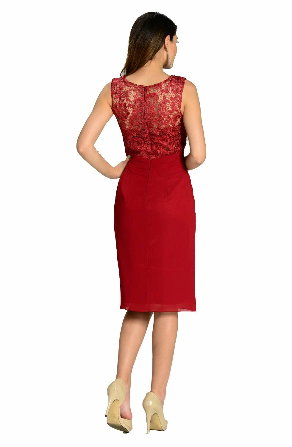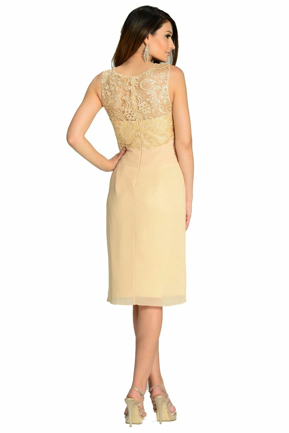 Show off your fashion sense in this short champagne chiffon dress with lace bodice by Poly USA Style Number 7208. This sleeveless dress features an illusion crew neckline and a lace top. A flirty back cutout, a modest knee-length skirt, and a zip closure complete this beautiful look. Perfect for any semi-formal event!