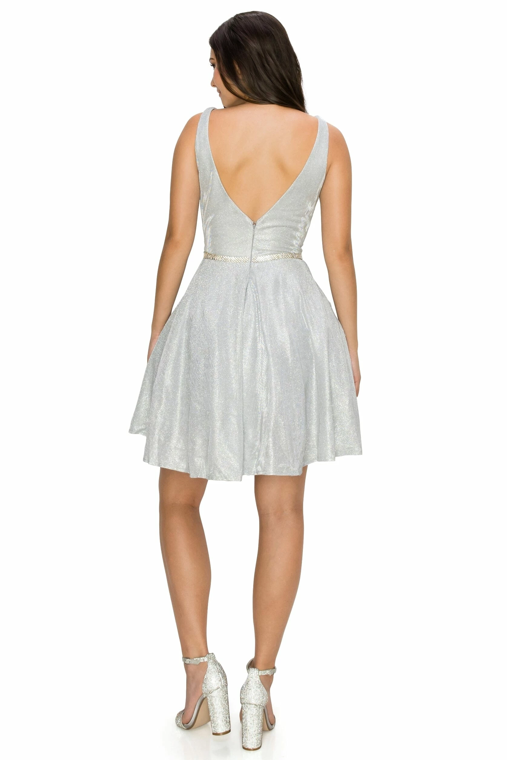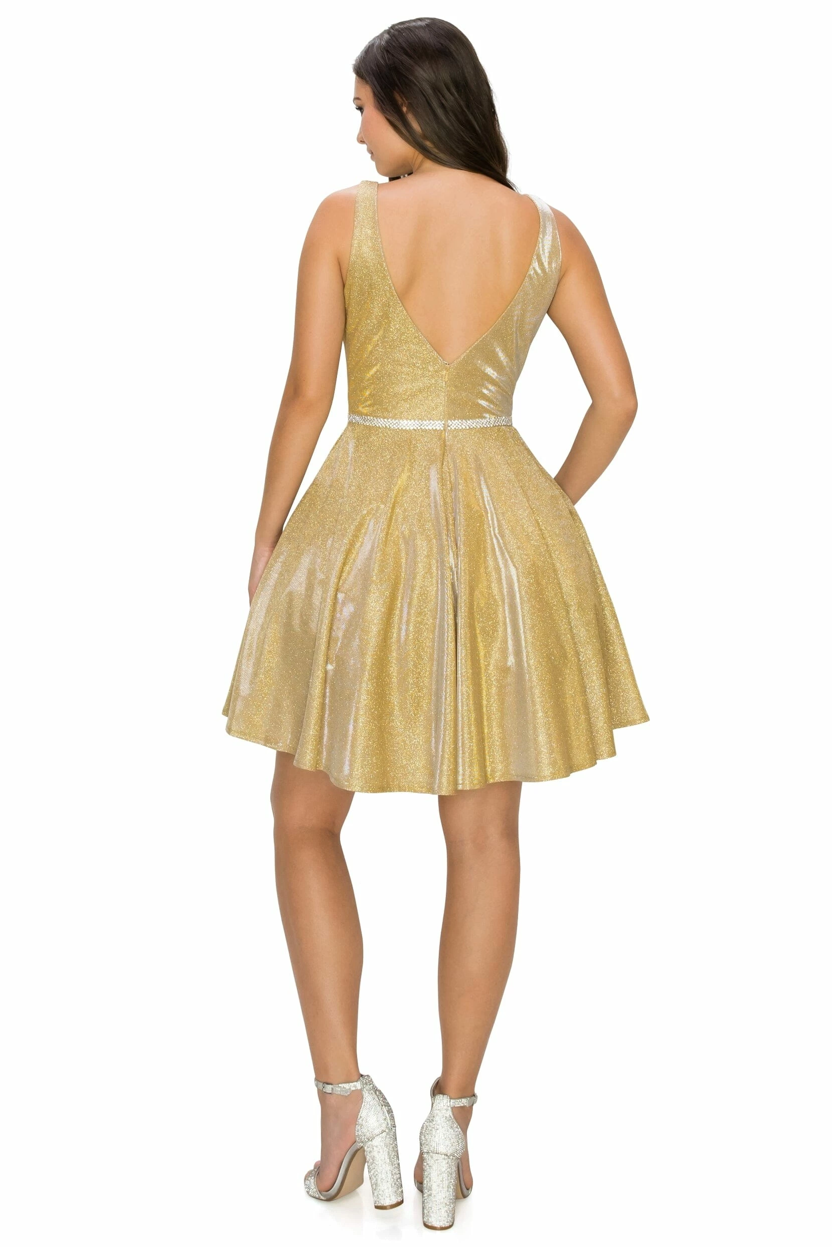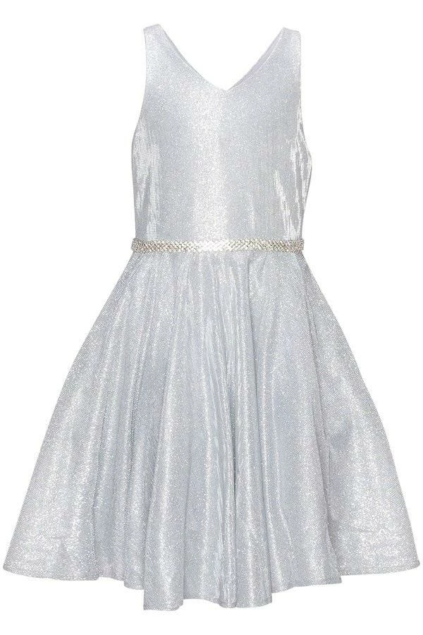 Dazzle the room in this short V-neck metallic glitter dress with A-line skirt by Cinderella Couture 8013J. This cocktail dress features a sleeveless with a slightly curved V-neck bodice secured with a sheer inset, tank straps, beaded waistband, open V-back, side pockets, short A-line skirt, and a zipper back.