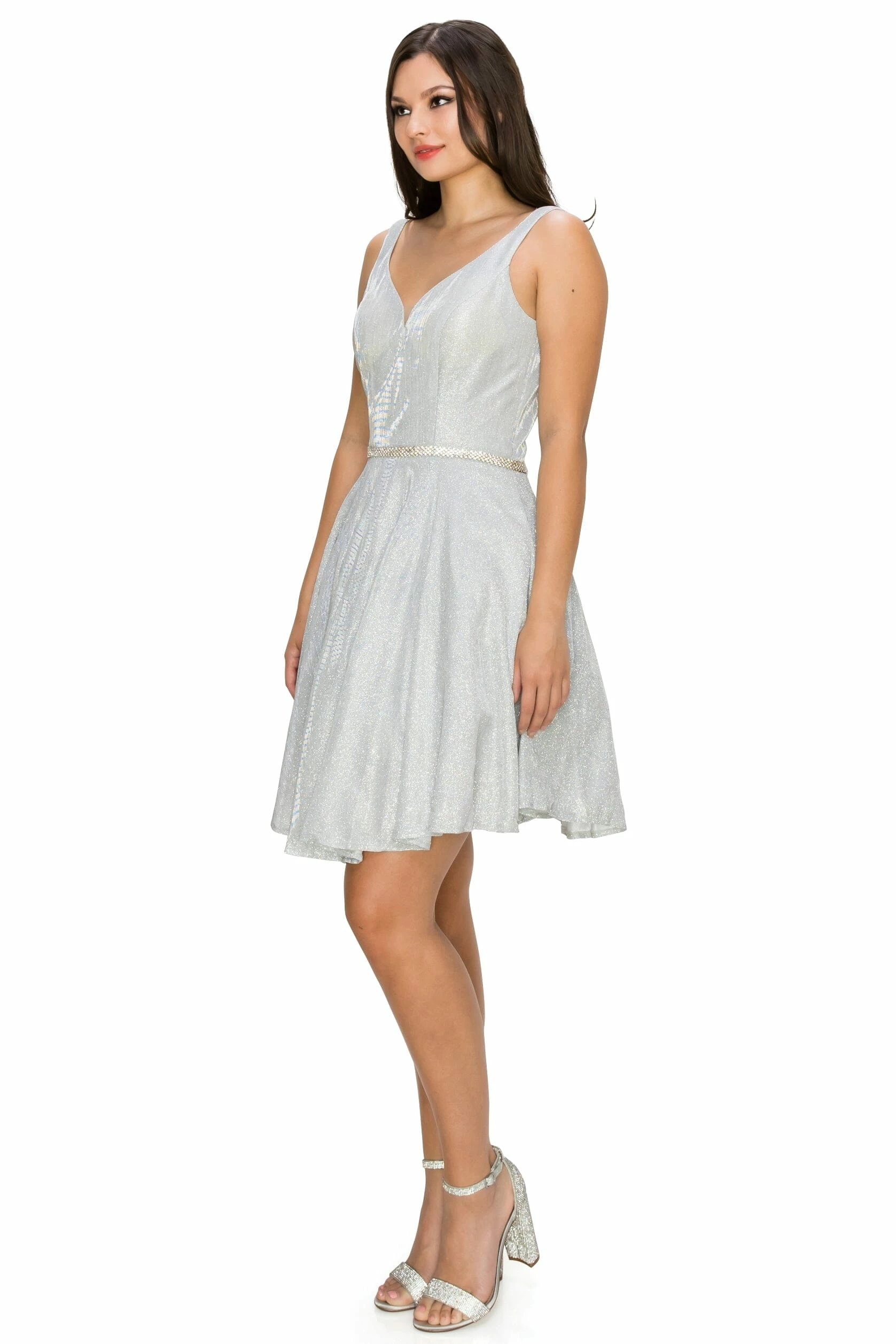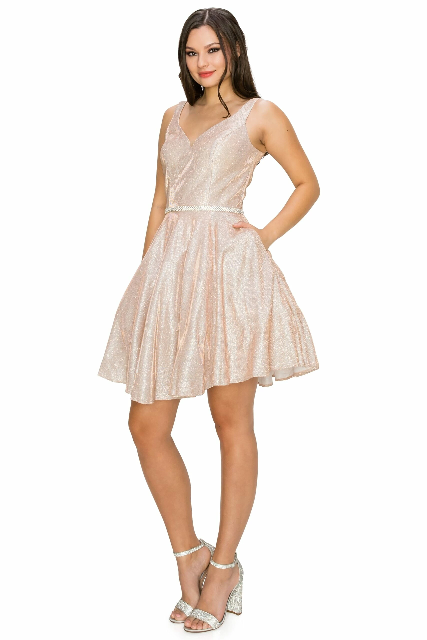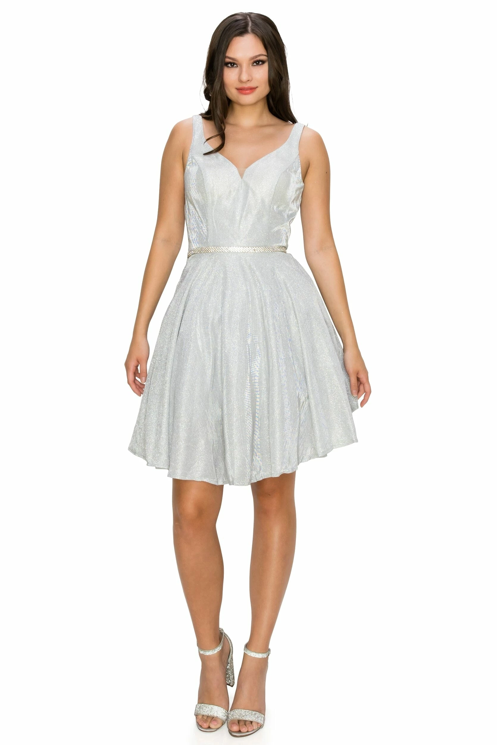 Dazzle the room in this short V-neck metallic glitter dress with A-line skirt by Cinderella Couture 8013J. This cocktail dress features a sleeveless with a slightly curved V-neck bodice secured with a sheer inset, tank straps, beaded waistband, open V-back, side pockets, short A-line skirt, and a zipper back.