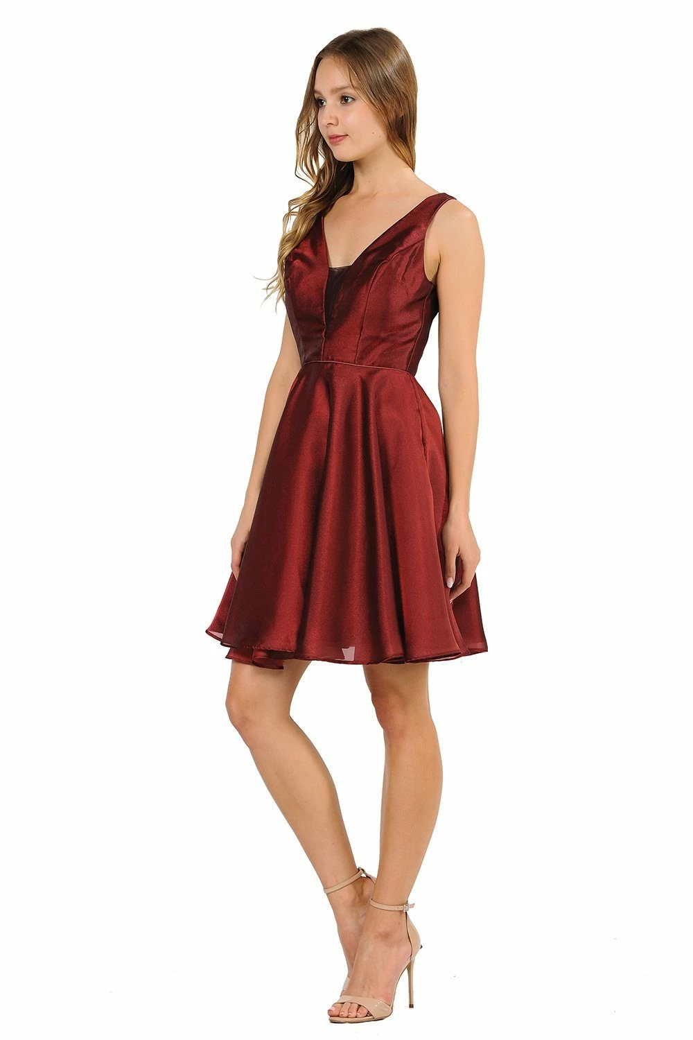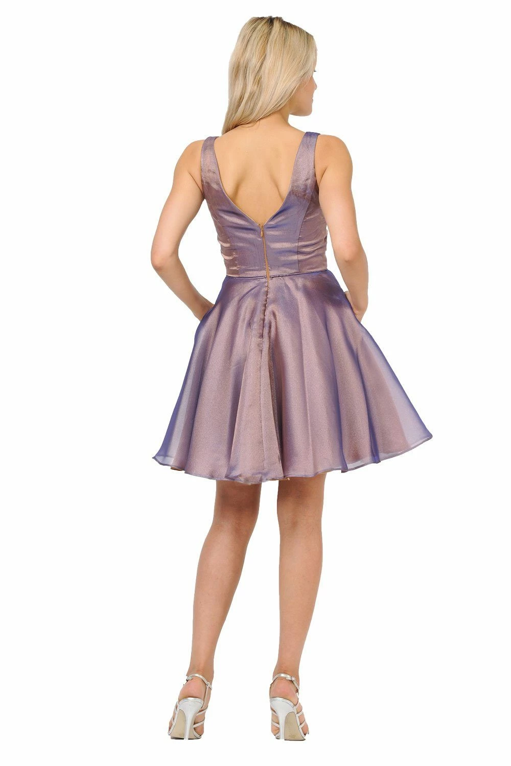 Be selfie-ready in this short V-neck metallic dress with side pockets by Poly USA 9018. Beautiful shiny sleeveless short dress with deep V-neckline, sheer inset panel, side pockets, open V-back, and a zipper closure. Affordably priced at $125, this short dress is perfect for any semi-formal event and will keep you on budget!