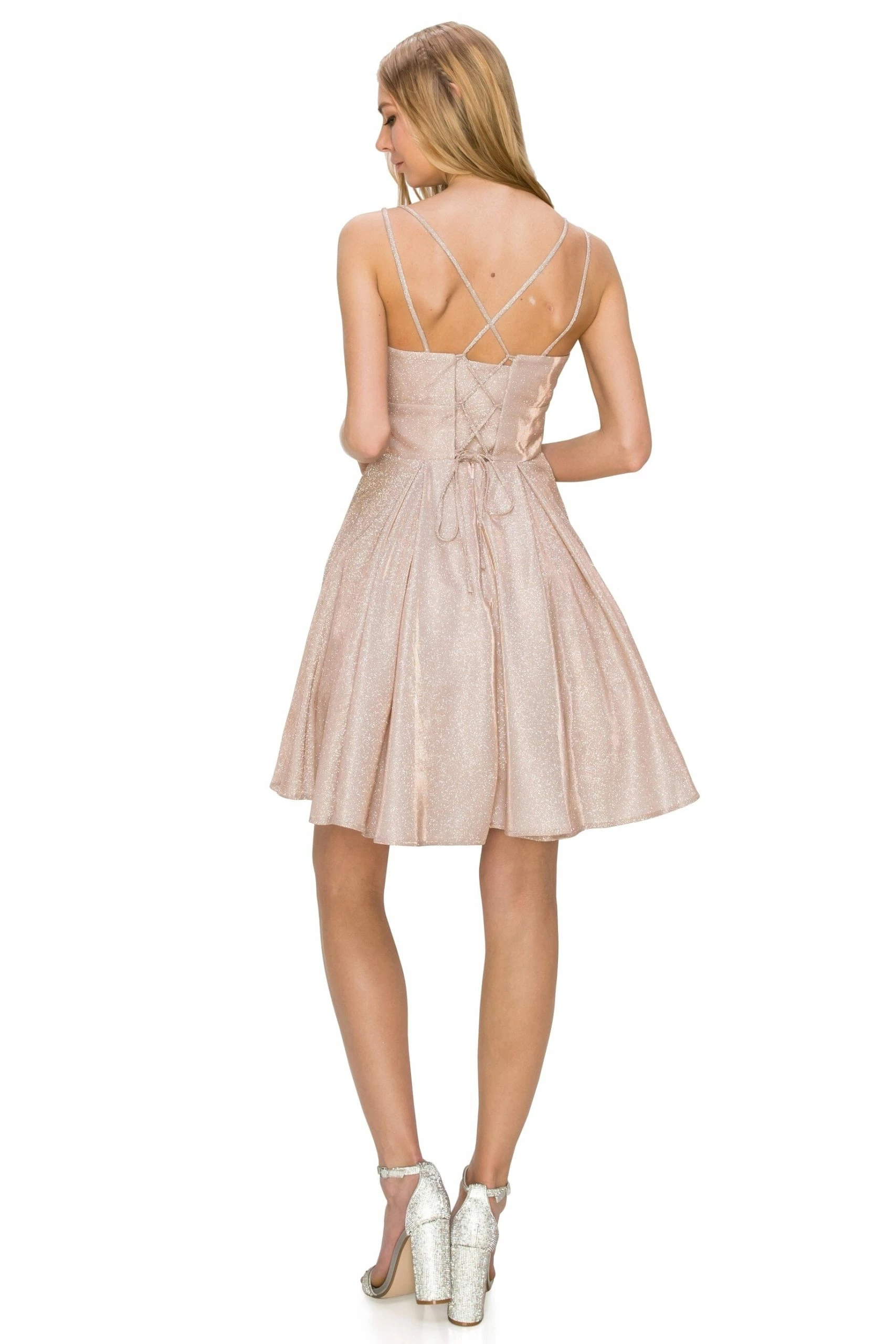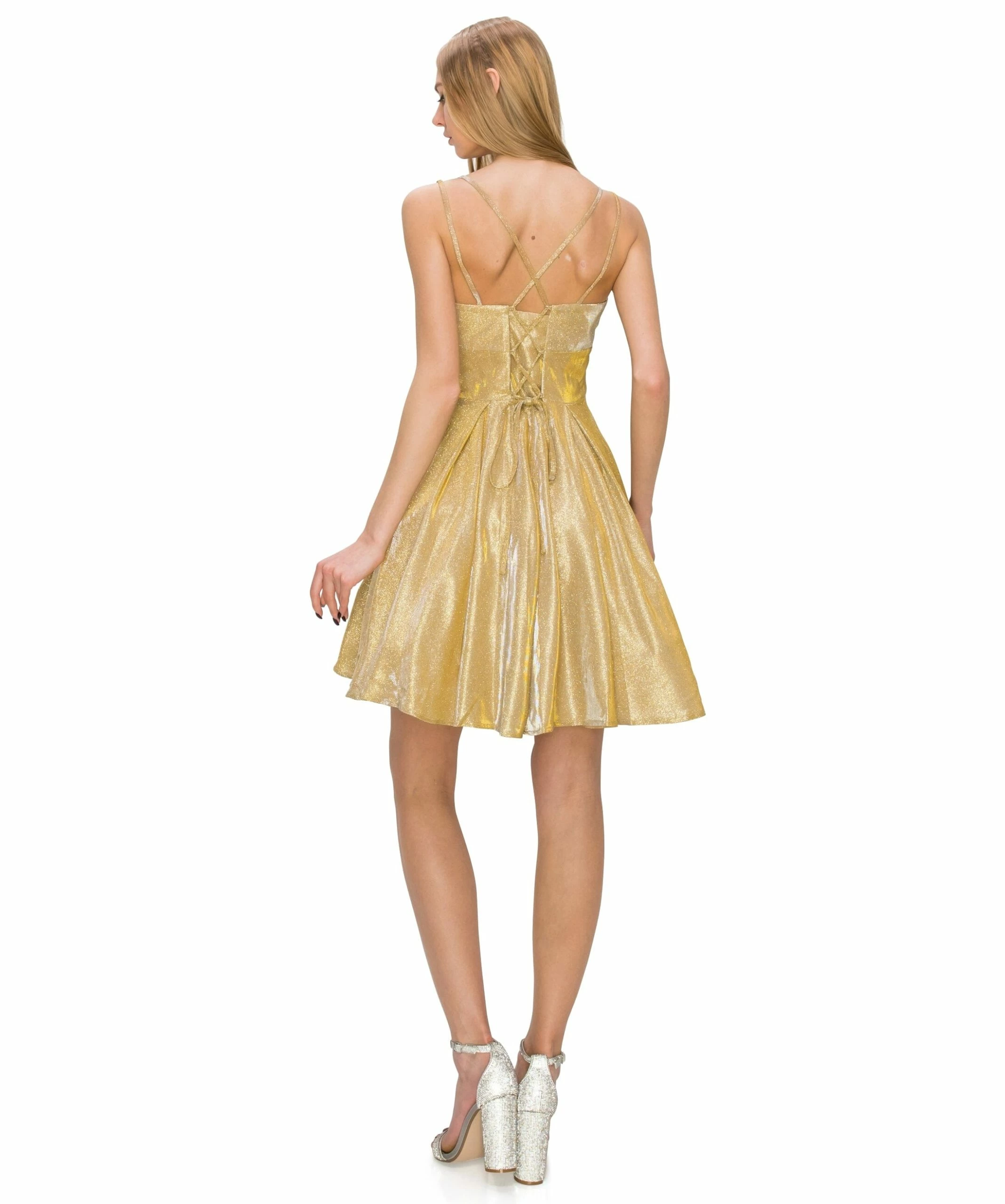 All eyes will be on you in this short A-line metallic glitter dress with lace-up back by Cinderella Couture 8011J. This cocktail dress features a sleeveless sweetheart fitted bodice with double spaghetti straps, short A-line skirt, and a lace up back.