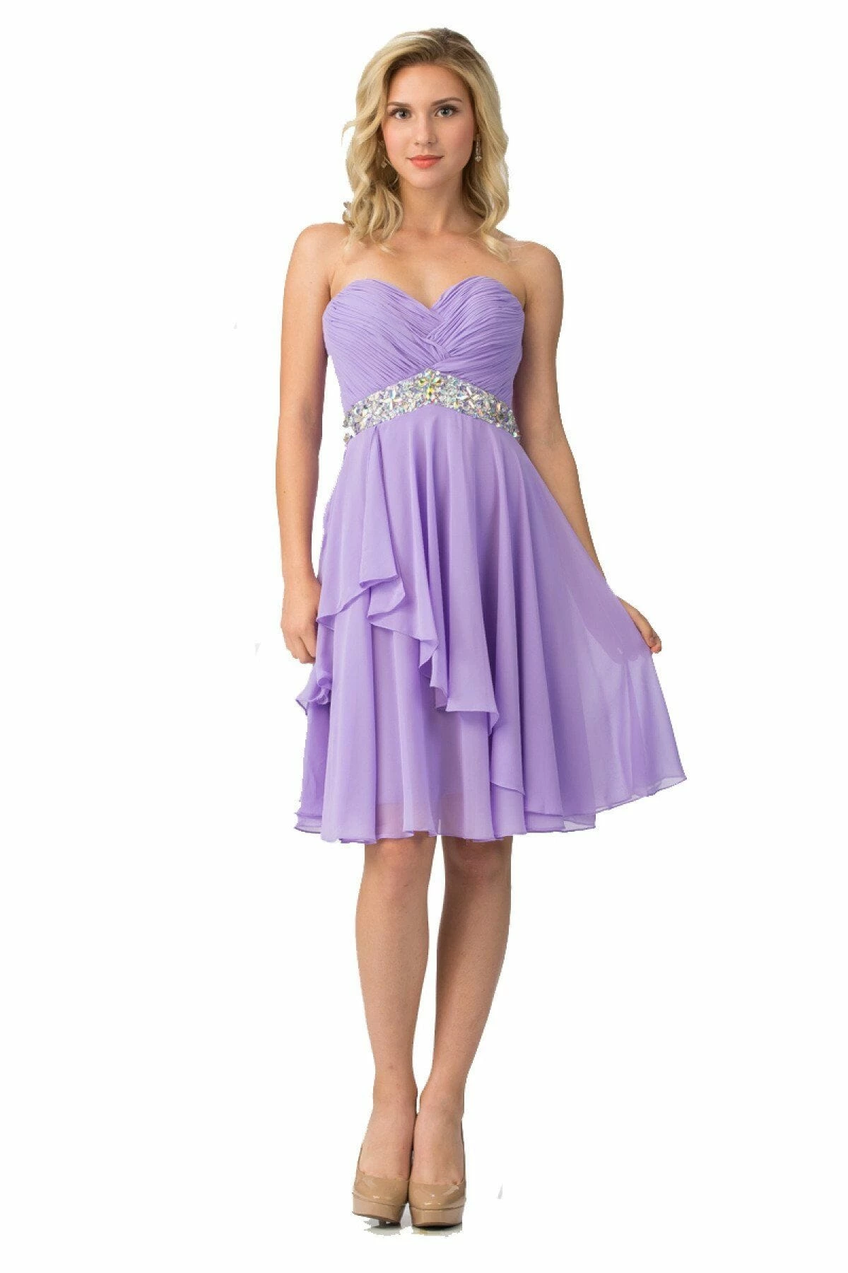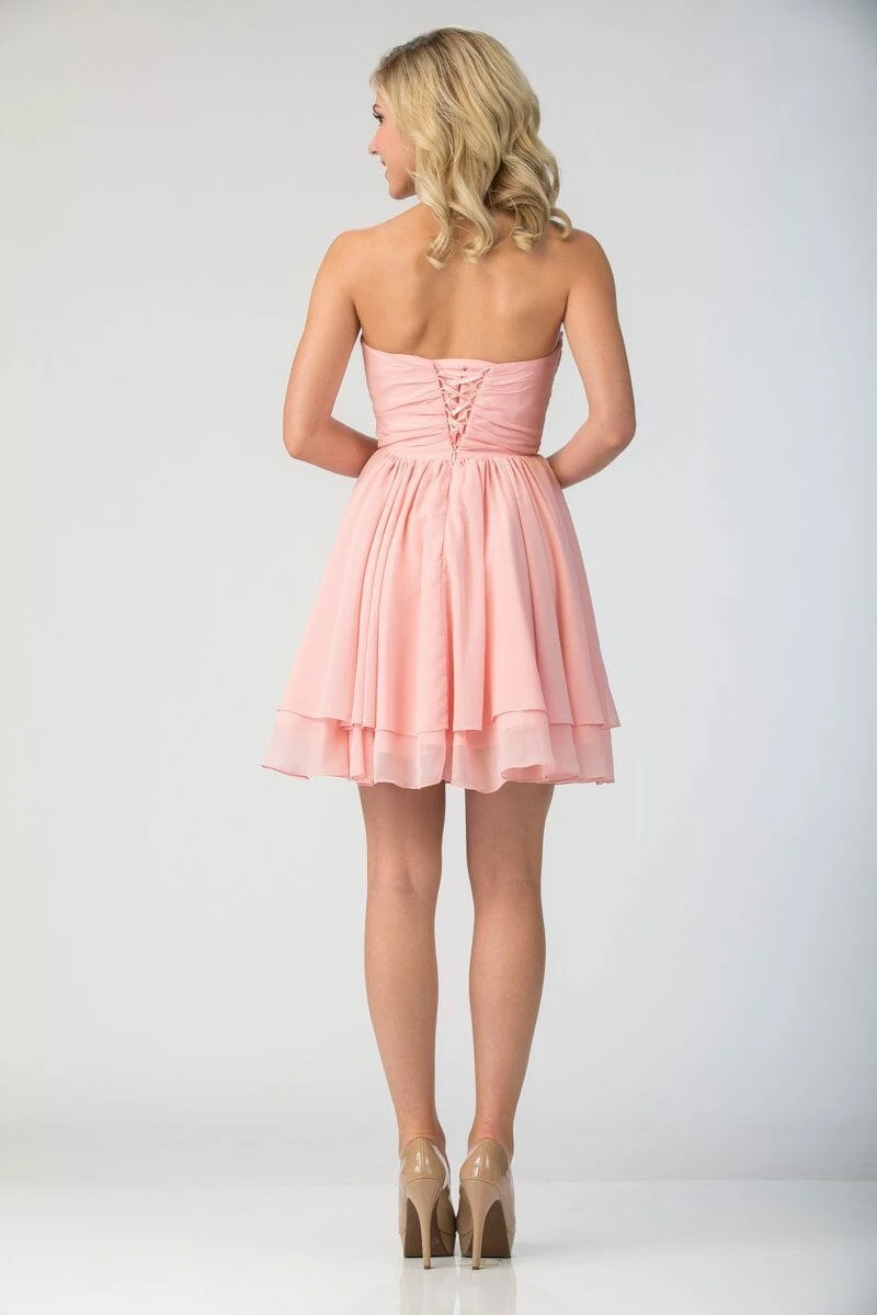 Be selfie ready in this strapless sweetheart knee-length cocktail dress with corset back by Star Box 6071. This beautiful short dress features a ruched strapless sweetheart bodice, beaded empire waistline, short A-line skirt that gracefully falls at the knees, and a lace-up corset back with zipper closure.