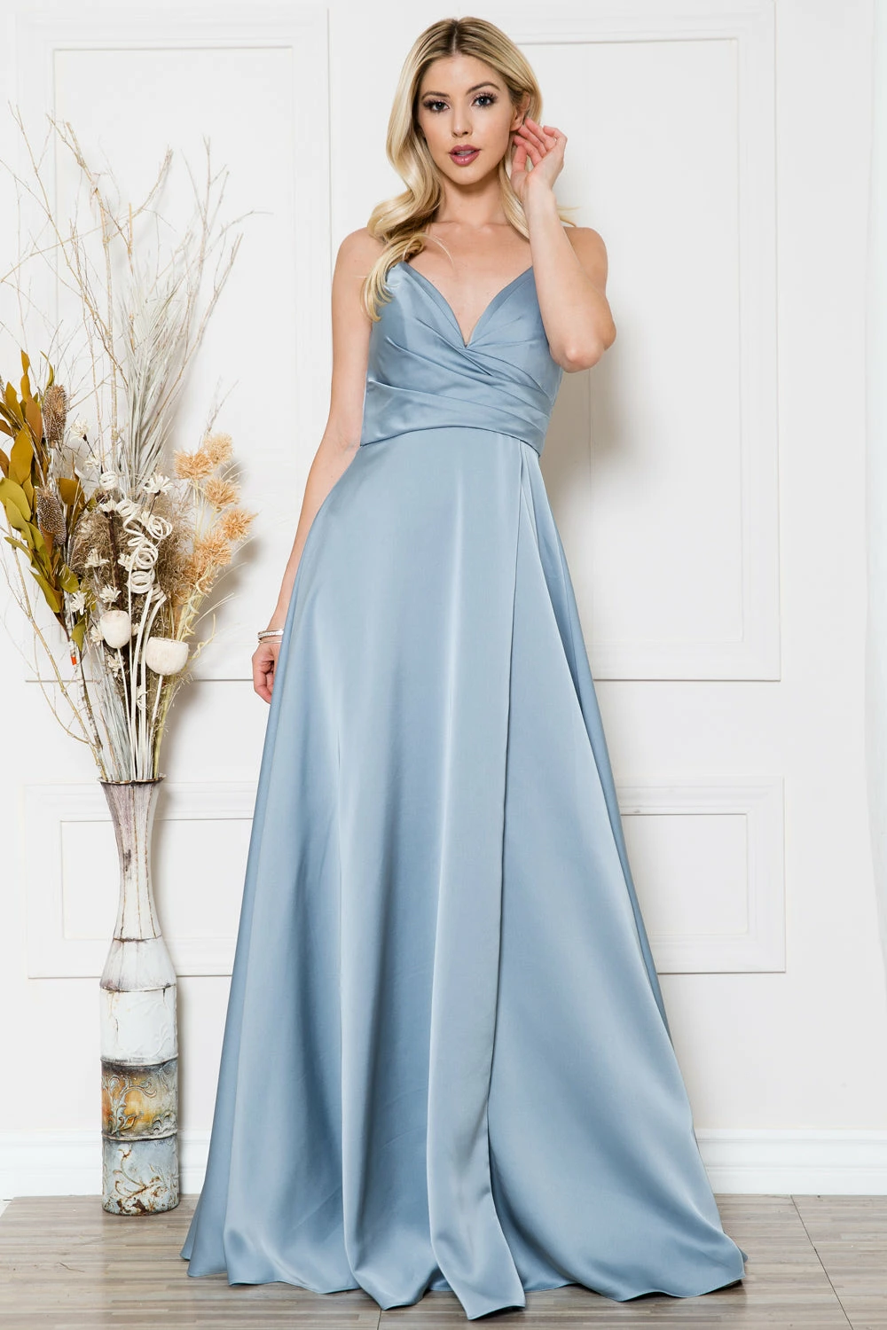 Make lasting memories in this ruched long sleeveless satin dress with A-line slit skirt by Amelia Couture BZ012. Classic satin A-line maxi dress with spaghetti straps and a zipper back.