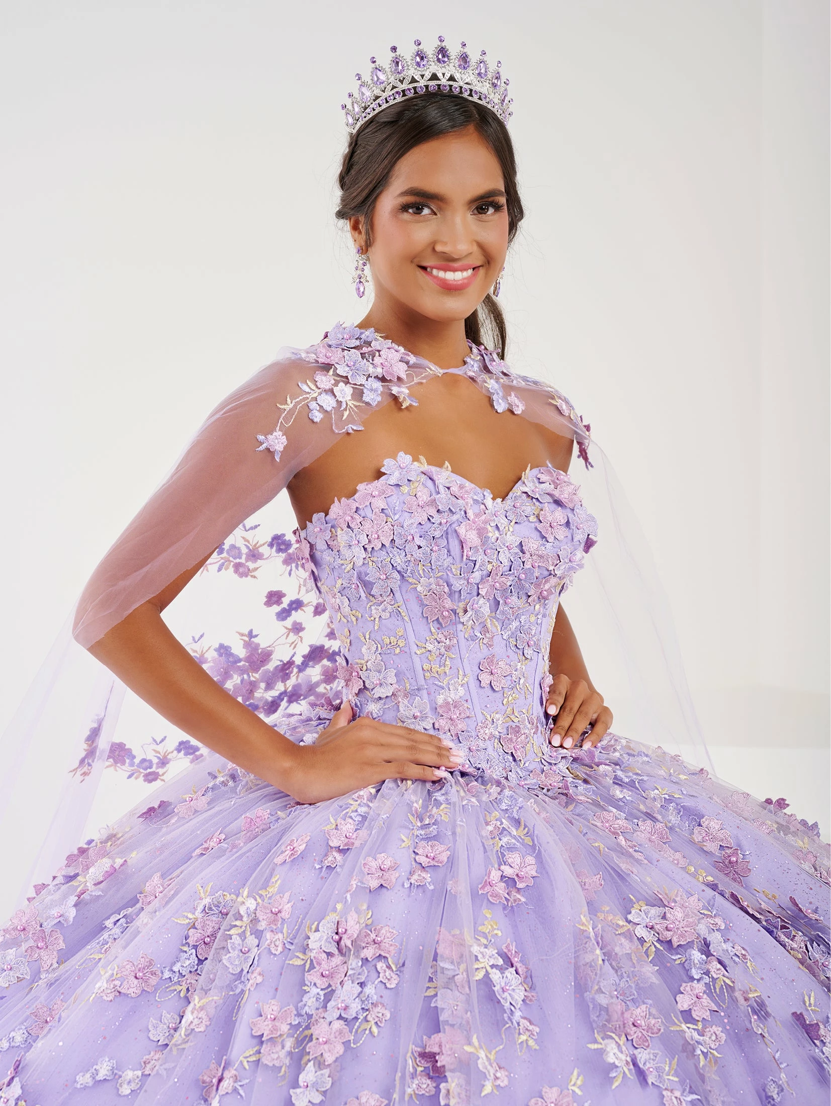 All eyes will be on you in this 3D floral applique long strapless corset cape dress with A-line skirt by House of Wu Fiesta Gowns 56494. Strapless corset bodice with fully appliques, lace applique embroidered ball gown tulle skirt, and a lace-up back. Matching and removable cape is included.