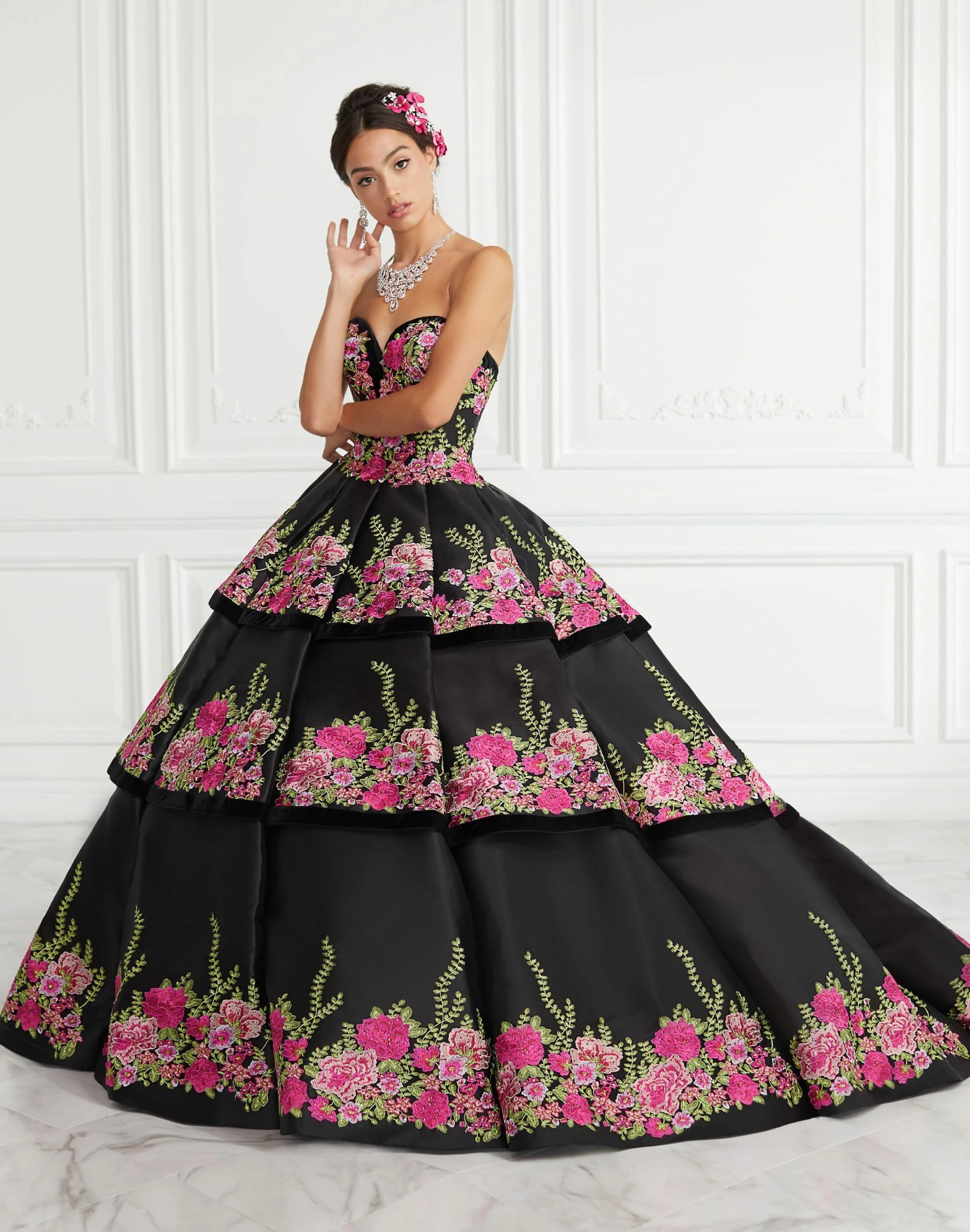 Look like a fairy-tale Princess in this floral embroidered long strapless sweetheart dress with A-line skirt by House of Wu Quinceanera Collection 26952. Made out of mikado, this beautiful ball gown features a sweetheart neckline with Charro floral embroidery lace, rhinestone with velvet ribbon neckline, 3 layers of ruffle ball gown skirt finished with embroidery hem edges. This look is finished with a lace-up corset back and a sweep train.