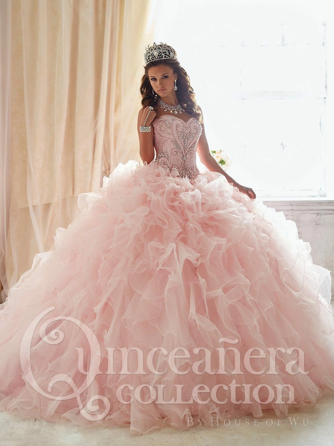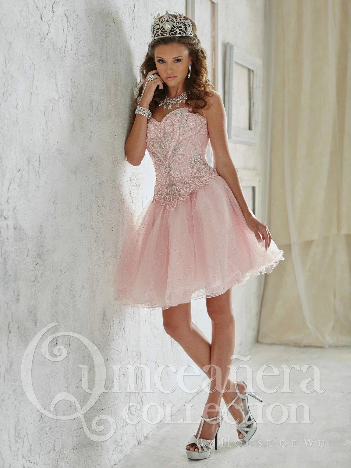 Captivate the room in this two-piece long strapless sweetheart dress with A-line ruffled skirt by House of Wu Quinceanera Collection 26818. Hidden with flowing ruffles, you will find glittering additions of tulle. The outer skirt is fully removable, giving way to a short and fun tulle skirt. The bodice is remarkable for its large, shining heart-shaped bead pattern. This look is finished with a lace-up corset back and a sweep train.